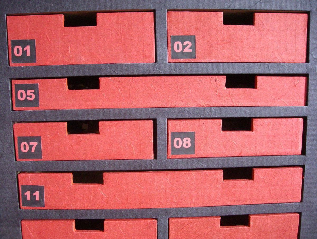 Sur carton ondulé, pose de papier murier rouge, papier kraft noir et peinture grise pour l'intérieur des niches (même couleur que les murs de la pièce). Les tiroirs du bloc carton Lego sont numérotés.